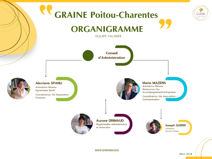 L’équipe du GRAINE Poitou-Charentes est constituée de 8 administrateurs et 3 salariées. Un.e volontaire en Service Civique est régulièrement accueilli.e.